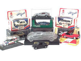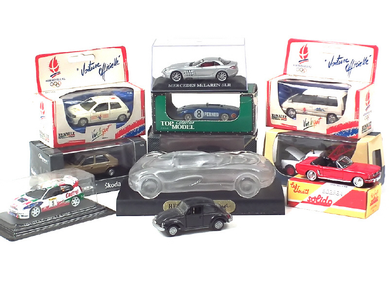 miniatures reproduisant les modèles : SKODA, MERCEDES, FORD (2 exemplaires différents), PEUGEOT, GORDINI, TOYOTA, VOLKSWAGEN (sans boîte) & RENAULT (3 exemplaires différents dont un en verre longueur 18cm) - on y retrouve notamment les marques : ABREX, DETAIL CARS, EDITIONS ATLAS, TOP MODEL & SOLIDO - 2 boîtes en état 'c'