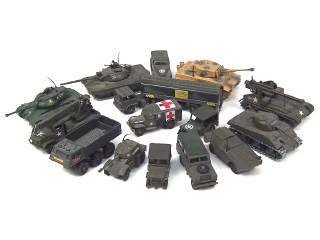 miniatures reproduisant notamment les modèles : TIGRE, DODGE, BERLIET, SAVIEM, LEOPARD, BTR & LAND ROVER - quelques carrosseries encrassées - avec manques