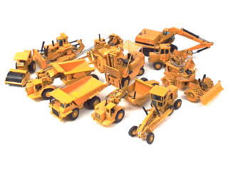 différentes échelles - comprend notamment : pelleteuse sur chenilles, profileur, camion benne basculante, chargeuse sur pneus & chariot à fourches - carrosseries encrassées