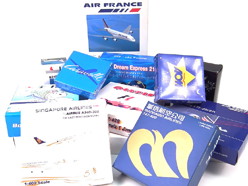 échelles 1/4000ème (majoritairement) - miniatures reproduisant notamment les modèles : CARAVELLE, AIRBUS & BOEING - les compagnies : AIR FRANCE, AIR CANADI, SINGAPOUR AIRLINES, CATHAY PACIFIC & IBERIA - on y retrouve notamment les marques : TUCANO LINE, HAIR SHOP, DRAGON WINGS & AEROCLASSICS - quelques boîtes en état 'c'