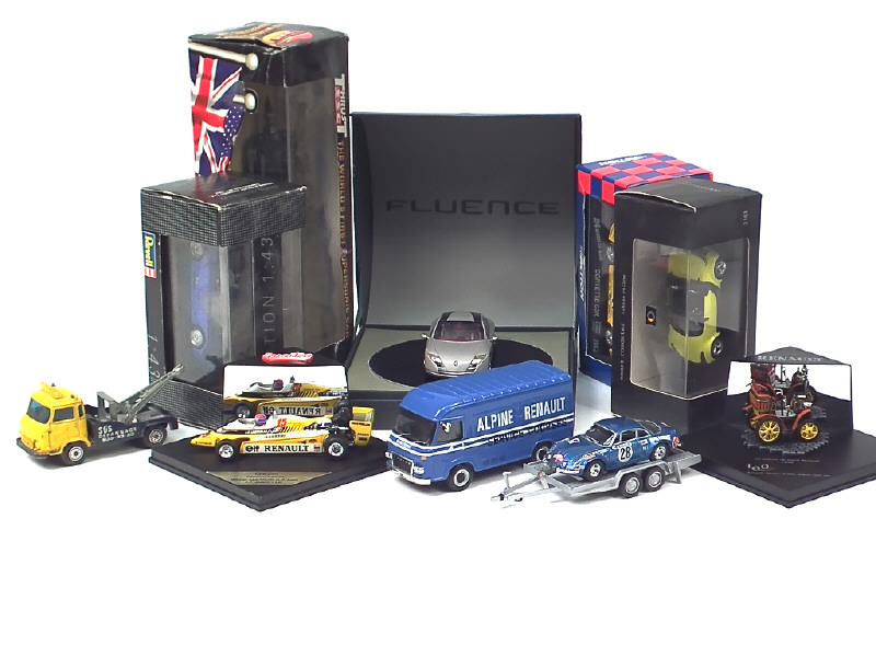 miniatures reproduisant notamment les modèles : RENAULT, SMART, CHEVROLET, BUGATTI & SAVIEM (état 'E', petits détails de peinture ajoutés) - on y retrouve notamment les marques : QUARTZO, SOLIDO & REVELL - 2 véhicules sans boîte - 2 boîtes en état 'c'