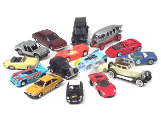 miniatures reproduisant notamment les modèles : PORSCHE, MATRA, ROLLS ROYCE, FIAT, OPEL & ISOTTA FRASCHINI (avec traces de métal fatigue) - on y retrouve notamment les marques : CLE (un modèle en état 'R'), BRUMM, RIO, MERCURY & REVELL - quelques éléments cassés à recoller - petits manques