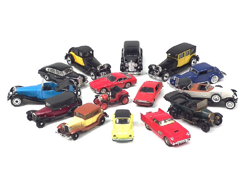 miniatures reproduisant notamment les modèles : DELAHAYE, RENAULT, MERCEDES, ALFA ROMEO & FERRARI - on y retrouve notamment les marques : POLISTIL, DUGU, MODEL BEST & RIO - quelques éléments cassés à recoller - possibilités de petits manques