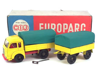 C.I.J. (FRANCE) 9/22 SAVIEM JL20 Plateau à ridelles bâché avec remorque bâchée jaune, rouge & vert