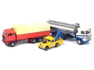 états de 'B' à 'C' - comprend : SCANIA 140 citerne laitier, VOLVO plateau à ridelles bâché (4 parties fondues sur la bâche, décolorée & éléments cassés) & LAND ROVER dépanneuse (jantes fondues)