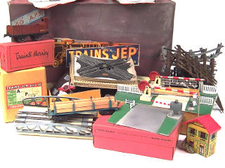 états de 'A-' à 'D' - comprend notamment wagons, passages à niveaux, transformateurs & pont - on y retrouve les marques : HORNBY FRANCE, JEP & LR - on y joint un coffret vide de la marque JEP & un ensemble important de différents rails de la marque - quelques manques
