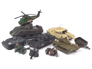 DIVERS Ensemble de 6 véhicules militaires, un hélicoptère, 5 canons & une remorque kaki