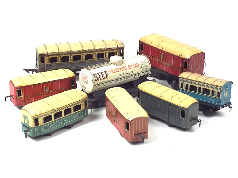 différentes échelles - comprend : 5 wagons & 3 voitures de voyageurs (dont une en état 'E') - avec parties non d'origine, repeintes & restaurées