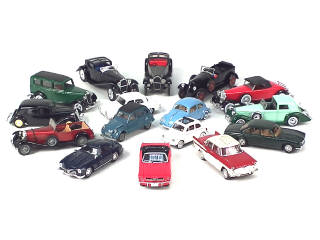 miniatures reproduisant les modèles : RENAULT (3 exemplaires différents), BUGATTI (2 exemplaires), JAGUAR, MERCEDES (2 exemplaires différents), FORD (2 exemplaires différents), DELAGE, CITROEN (2 exemplaires différents), VOLKSWAGEN, PEUGEOT, ALPINE, FIAT, DUESENBERG, SIMCA (importantes craquelures sur le toit) & AC - avec manques