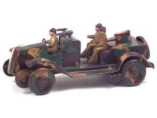 longueur 22 cm - moteur à ressort (à revoir) - avec 3 soldats - traces d'oxydation principalement sur le plancher & le moteur - quelques éléments non d'origine
