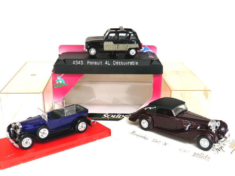 miniatures reproduisant les modèles : FIAT Papale (manque capote), RENAULT 4L découvrable parisienne & MERCEDES 540K cabriolet fermé (manque mascotte de radiateur)