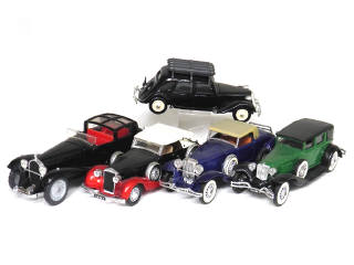 série AGE D'OR - miniatures reproduisant les modèles : CITROEN, DELAGE, BUGATTI (version avec jantes métal), DUESENBERG (petits manques) & CORD - carrosseries légèrement poussiéreuses