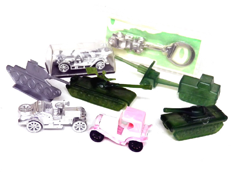 petites échelles - réalisations en plastique - comprend : 4 voitures dont une en boîte & une en porte-clés sous blister, 3 chars & un engin blindé de reconnaissance tractant un canon