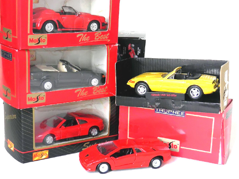 miniatures reproduisant les modèles : FERRARI 365 GTS4 cabriolet, FERRARI 348 TS, LAMBORGHINI DIABLO, PORSCHE 911 Speedster & MERCEDES 500SL cabriolet - on y retrouve les marques : SHELL & MAISTO