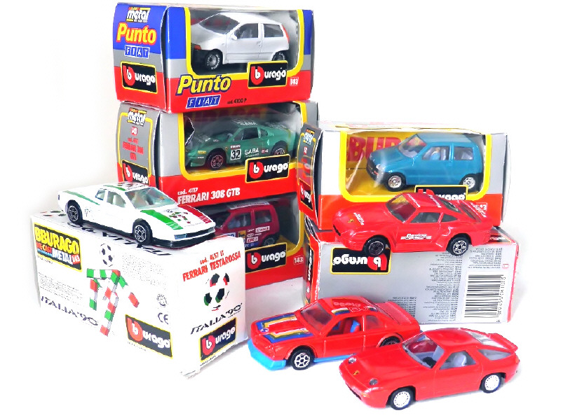 miniatures reproduisant les modèles : FIAT CINQUECENTO, FIAT PUNTO, FERRARI 308GTB, FERRARI TESTAROSSA 'ITALIA 90', PORSCHE 959 & PORSCHE 928 S4 (sans boîte) - 4 modèles avec jantes améliorées - on y joint une BMW coupé dans le style BBURAGO