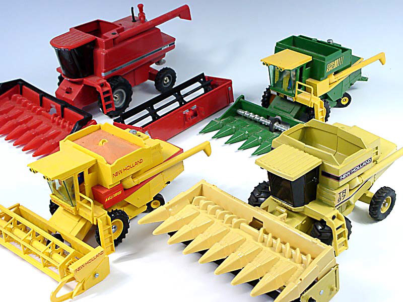 miniatures reproduisant des machines de marques : CASE, NEW HOLLAND & CORN KING - dont 2 avec accessoires interchangeables