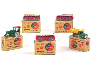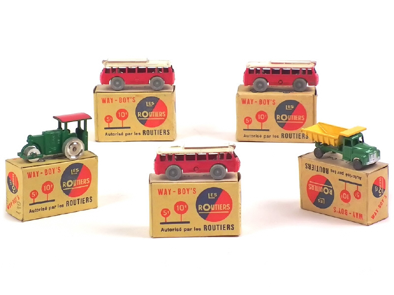 comprend : autocar (3 exemplaires identiques dont un en état 'C' & un autre 'B'), rouleau à vapeur (état 'B', un éclat sur une extrémité de toit) & camion-benne carrière