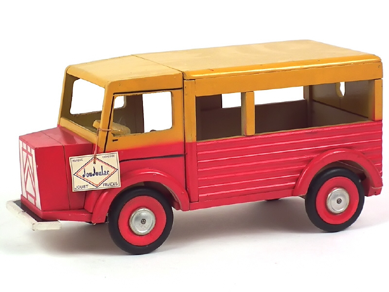 réalisation en bois peint - longueur 42 cm - avec étiquette d'origine de la marque - manque de vernis plus ou moins important sur les jantes - une craquelure sur la portière avant droite