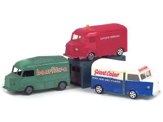 échelle 1/32ème - comprend les versions : 'SAPEURS POMPIERS', 'GEANT CASINO' & 'BOURLIERE' (en état 'C', carrosserie déformée avec petits manques) - on y joint un garage de la marque CLE à l'échelle 1/43ème en état 'B'