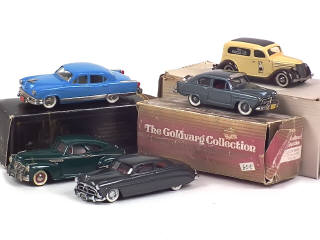 comprend : KAISER MANHATTAN 1953 (boîte en état 'd'), HUDSON HORNET 1952 (sans boîte), FORD V8 fourgonnette 'MINI MARQUE 43' (état 'B', manque rétroviseurs, carrosserie encrassée), BUICK 1941 (manque décoration d'aile arrière gauche, sans boîte) & HENRY-J KAISER 1951(boîte en état 'e', avec petit dépliant de la marque) - on y retrouve les marques : BROOKLIN, WESTERN MODELS, PRECISION MINIATURES & THE GOLDVARG COLLECTION