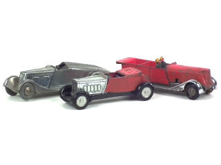 comprend les versions : pompiers (moteur à clef fonctionne) & roadster (quelques parties repeintes) - on y joint un roadster 'MESAUTOS' (une roue manquante) - petits manques