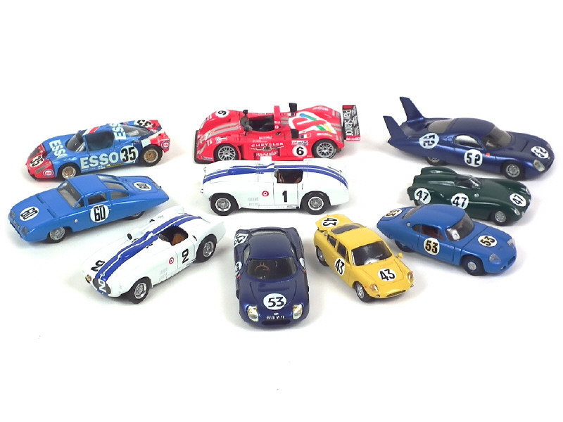 miniatures reproduisant notamment les modèles : CD PEUGEOT, PANHARD, CUNNINGHAM & SIMCA - on y retrouve notamment les marques : COLLECTION TEAM, PROVENCE MOULAGE, SEVENKIT & SPARK - 9 kits montés - possibilité de petits manques