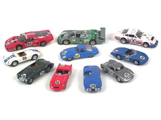 kits montés - miniatures reproduisant notamment les modèles : PORSCHE, FERRARI, AUSTIN HEALEY & ASTON MARTIN (aileron à refixer) - on y retrouve notamment les marques : TACOT, MANOU, JOHN DAY & AMR - possibilité de petits manques