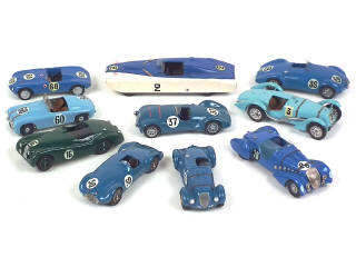 kits montés - miniatures reproduisant notamment les modèles : CUNNINGHAM, TALBOT, JAGUAR, PEUGEOT, SIMCA & SIMCA GORDINI - on y retrouve notamment les marques : GRAND PRIX MODELS, MANOU, ESDE, CCC, MIKANSUE - possibilité de petits manques