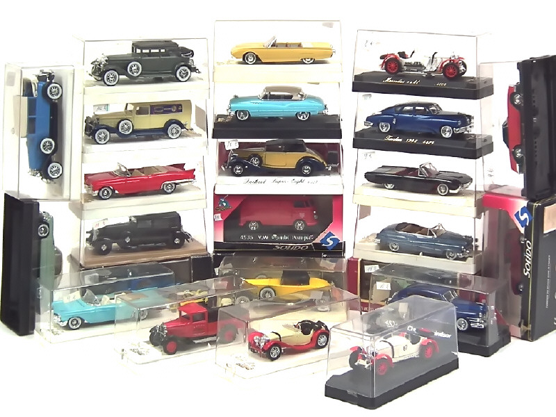 miniatures reproduisant les modèles : CITROEN, CHRYSLER, DUESENBERG, FACEL VEGA, BUICK (3 exemplaires différents) dont un avec boîte non conforme), CADILLAC (5 exemplaires différents), MERCEDES (2 exemplaires différents), FORD (2 exemplaires différents), VOLKSWAGEN (petits manques & parties cassées), RENAULT (2 exemplaires différents, JAGUAR, TUCKER, HISPANO SUIZA, BUGATTI & PACKARD - 2 boîtes en état 'c'