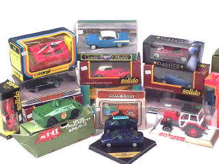 différentes échelles - on y retrouve notamment les marques : CORGI TOYS, SOLIDO, MAJORETTE, VITESSE, DINKY MACHTBOX, VICTORIA, TROFEU, TOMICA DANDY & GOZAN - possibilité de petits manques - quelques boîtes en état 'c'