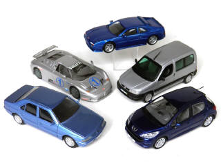 miniatures reproduisant les modèles : BUGATTI EB 110 sport, PEUGEOT 207, PEUGEOT PARTNER, PEUGEOT 405 & VENTURI - on y retrouve les marques : NOREV, VITESSE & PARADCAR