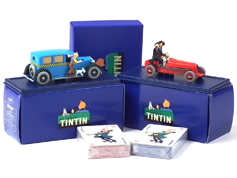 collection 'EN VOITURE TINTIN' - sous boîte-vitrine - tiré de l'album 'TINTIN EN AMERIQUE' - avec certificat d'authenticité - on y joint un coffret de 2 jeux de cartes de la collection