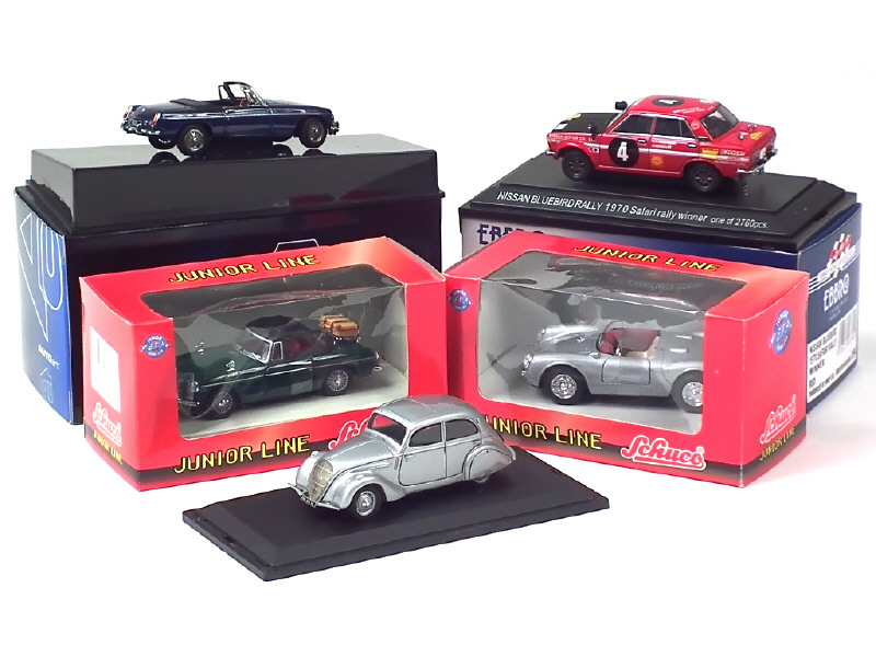 comprend : MGB (2 exemplaires différents), NISSAN BLUE BIRD rallye, PORSCHE 550 spyder & PEUGEOT 202 - on y retrouve les marques : SCHUCO, AUTO ART, EBBRO & PARADCAR