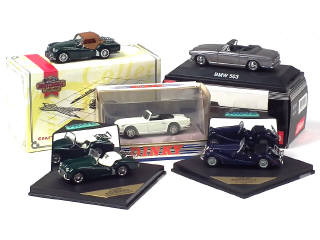 comprend : TRIUMPH TR3 (2 exemplaires différents), TR4, MORGAN + 8 & BMW 503 - on y retrouve les marques : DINKY MATCHBOX, VITESSE, SCHUCO & MATCHBOX COLLECTIBLES