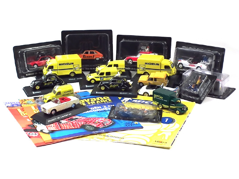 miniatures reproduisant notamment les modèles : PEUGEOT, HOTCHKISS, BEDFORD, RENAULT & CITROEN - 7 modèles de la caravane du Tour de France - quelques petits manques - on y retrouve notamment les marques : ALTAYA & EDITIONS ATLAS - on y joint 16 fascicules des collections