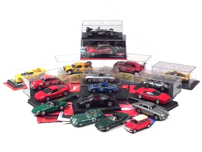 miniatures reproduisant notamment les modèles : ALPINE, MINI (état 'B' avec parties déformées), FERRARI, CITROEN, PEUGEOT, MERCEDES & JAGUAR - 8 modèles sans boîte - on y retrouve notamment les marques : NEWRAY, EDITIONS FABBRI, HACHETTE & ALTAYA - quelques petits manques - on y joint 13 fascicules des collections