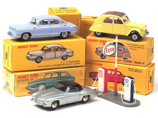 copie des modèles DINKY-TOYS FRANCE - comprend : CITROEN 2CV, DS 19 (sous film plastique jamais ouvert), ALFA ROMEO 1900, MERCEDES 190 SL & PANHARD PL 17 - sans certificats