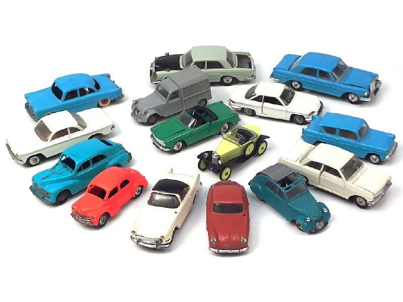 états de 'C' à 'D' - miniatures reproduisant les modèles : PANHARD, CITROEN (3 exemplaires différents), PEUGEOT, RENAULT, FORD, PORSCHE, OPEL, FIAT, CHEVROLET, MERCEDES (2 exemplaires différents) & SIMCA (2 exemplaires différents) - avec manques & parties cassées ou repeintes - carrosseries plus ou moins déformées avec quelques jantes fondues