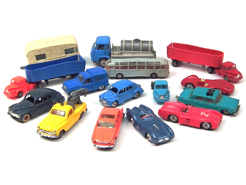états de 'C' à 'E' - miniatures reproduisant les modèles : PEUGEOT (3 exemplaires différents), FORD, MERCEDES (2 exemplaires différents dont un repeint), MASERATI, RENAULT (2 exemplaires différents dont un retouché), SAVIEM (2 exemplaires différents), UNIC (3 exemplaires différents) & DIGUE - avec manques, parties cassées & déformées