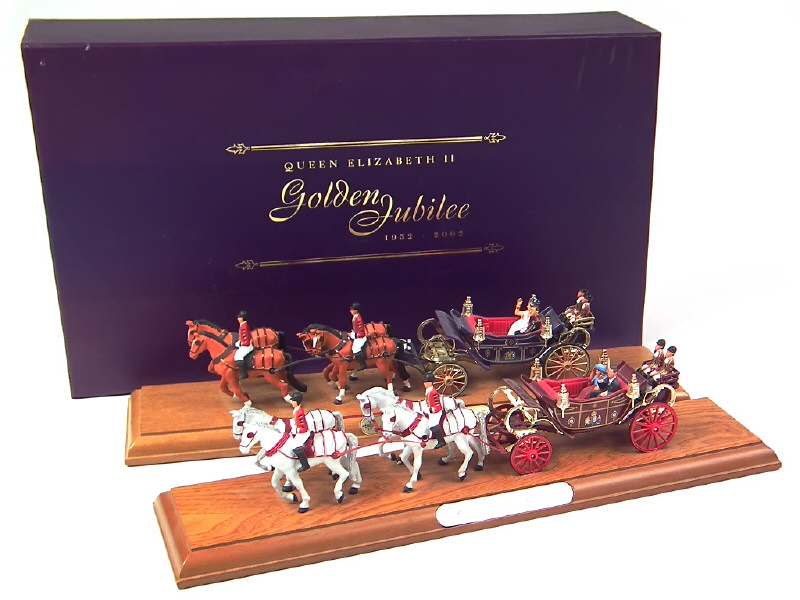 contient : carrosse de la reine Elisabeth II, 4 chevaux & 6 figurines dont le couple royal - sur socle de présentation en bois - manque cales de boîte