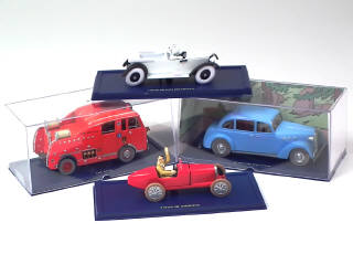 collection 'EN VOITURE TINTIN' - sous boîte-vitrine - comprend : le camion des pompiers (L'ILE NOIRE), la voiture de Bianca Castafiore (LE SCEPTRE D'OTTOKAR), la Mercedes torpedo (TINTIN AU PAYS DES SOVIETS) & le bolide de Bobby Smiles (TINTIN EN AMERIQUE) - manque certificats, surboîtes cartonnées & 3 illustrations