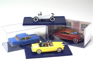 collection 'EN VOITURE TINTIN' - sous boîte-vitrine - comprend : l'AMILCAR (TINTIN AU PAYS DES SOVIETS), la LANCIA de l'italien ( L'AFFAIRE TOURNESOL), le taxi bleu ( L'ILE NOIRE) & la voiture bordure (L'AFFAIRE TOURNESOL) - manque certificats, surboîtes cartonnées & une illustration