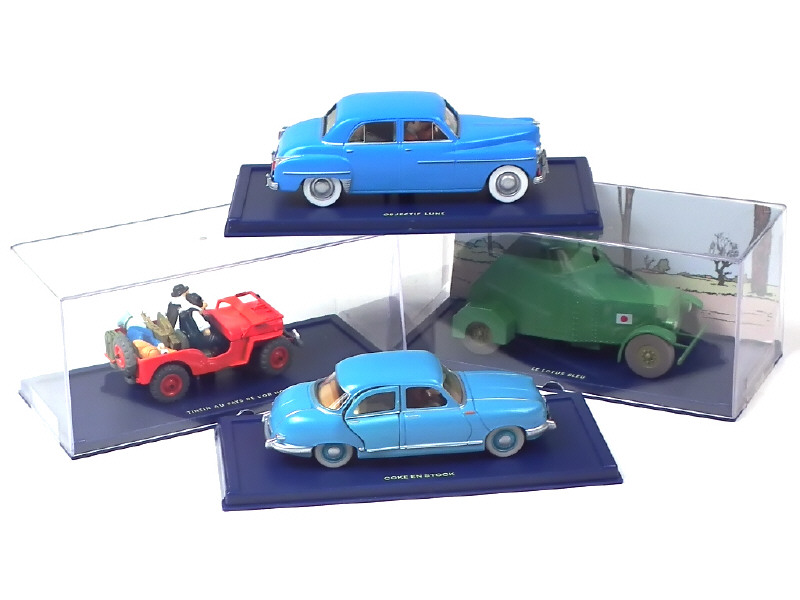 collection 'EN VOITURE TINTIN' - sous boîte-vitrine - comprend : la JEEP des DUPOND (TINTIN AU PAYS DE L'OR NOIR), l'automitrailleuse blindée (LE LOTUS BLEU), la DODGE (OBJECTIF LUNE) & le taxi PANHARD (COKE EN STOCK) - manque certificats, surboîtes cartonnées & 3 illustrations