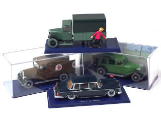 collection 'EN VOITURE TINTIN' - sous boîte-vitrine - comprend : l'ambulance de CHICAGO (TINTIN EN AMERIQUE), la limousine gouvernementale (TINTIN & LES PICAROS), le camion d'opium & la limousine (LE LOTUS BLEU) - manque certificats, surboîtes cartonnées & 2 illustrations