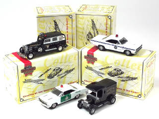 comprend : FORD T 'DALLAS POLICE', FAIRLANE 'MIAMI POLICE', PLYMOUTH 'DENVER POLICE DEPARTMENT' & CADILLAC 'SALT LAKE CITY OLICE DEPARTMENT'- avec suremballages cartonnés (quelques annotations)