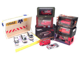 miniatures reproduisant les modèles : GMC (série télévisée 'AGENCE TOUS RISQUES', PEUGEOT, CITROEN (2 exemplaires différents), RENAULT (4 exemplaires différents dont 3 réunis dans un coffret 'SAMU 03'), AUDI (aileron cassé, un rétroviseur manquant & sans boîte), ARO & MAZDA - on y retrouve notamment les marques : NOSTALGIE, MATTEL, EBBRO, MATCHBOX, IST MODELS & UNIVERSAL HOBBIES