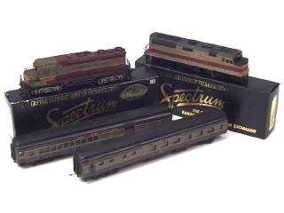 série 'SPECTRUM' - non testés - comprend : motrice diesel EMD F40PH, GP 30 'CANADIAN PACIFIC' (parties repeintes), voitures de voyageurs 'NEW-YORK CENTRAL' dont une mixte - quelques petits éléments non d'origine, d'autres manquants, petites parties cassées & carrosseries encrassées