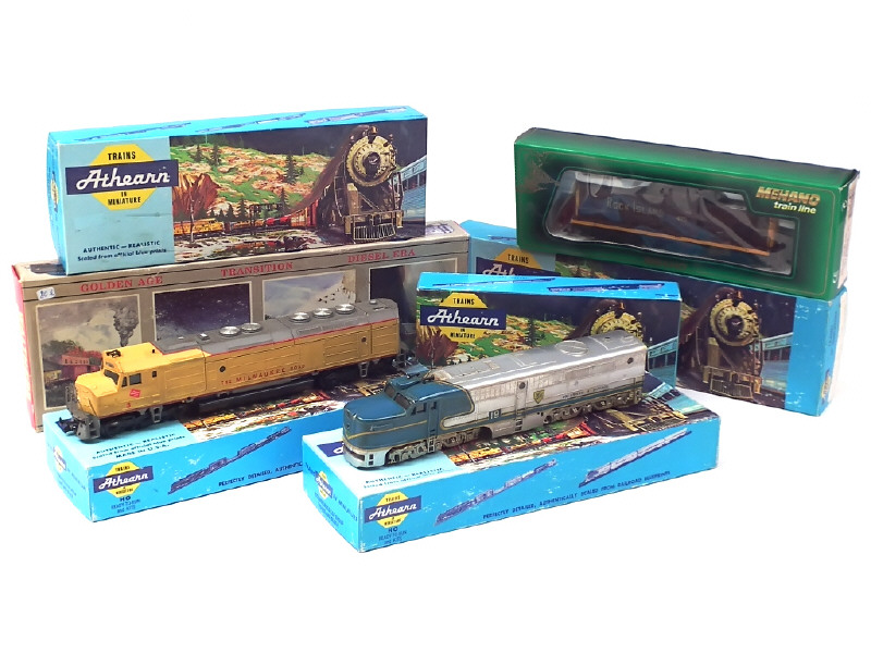 états de 'B' à 'C' - boîtes en état 'b' - non testées - comprend : PA-1 'DELAWARE & HUDSON', FP45 'THE MILWAUKEE ROAD', SW1500 'ROCK ISLAND', GP35 'SOUTHERN PACIFIC' & C449W 'CN' - on y joint une motrice C-415 'ROCK ISLAND' de la marque MEHANO & H12-44 'SOUTHERN PACIFIC' de la marque WALTHERS' - quelques petits manques, parties non d'origine & retouchées