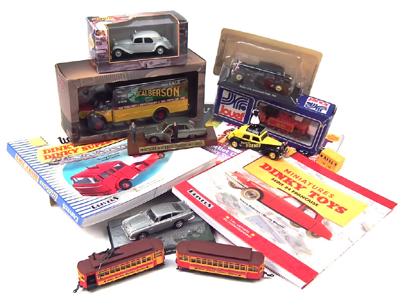 comprend : BERLIET GLR fourgon 'CALBERSON', CITROEN TRACTION (3 exemplaires différents dont un avec figurine à repositionner), ASTON MARTIN DB5 'JAMES BOND', PEUGEOT 604, locomotive à vapeur type 030 & tramway à 2 éléments (non testé & petits manques) - on y retrouve notamment les marques : VEREM, NOSTALGIE, EDITIONS ATLAS & JOUEF - 3 modèles sans boîte - on y joint 2 livres 'DINKY TOYS & DINKY SUPER TOYS' & 'SERIE 24 FRANCAISE', un classeur contenant différents fiches sur les trains JOUEF & 14 documentation diverses (La Vie du Jouet, JOUEF & VECTIS)