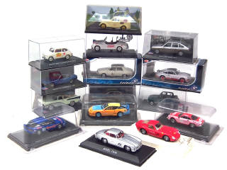 miniatures reproduisant les modèles : RENAULT, ALPINE, MERCEDES, SIMCA, SEAT, MATRA-SIMCA, FERRARI, PORSCHE, TALBOT & PEUGEOT (avec un vélo) - on y retrouve notamment la marque SOLIDO